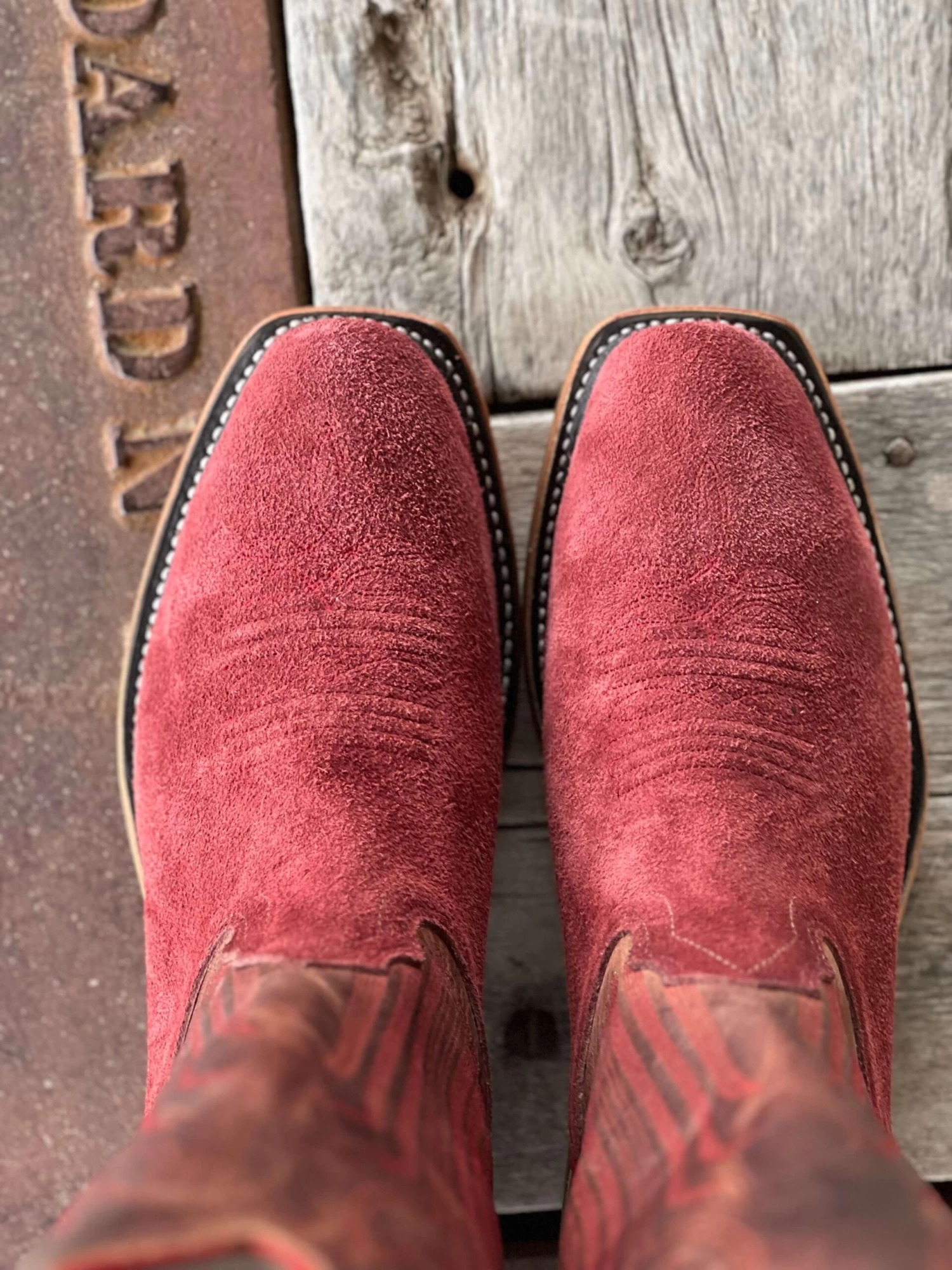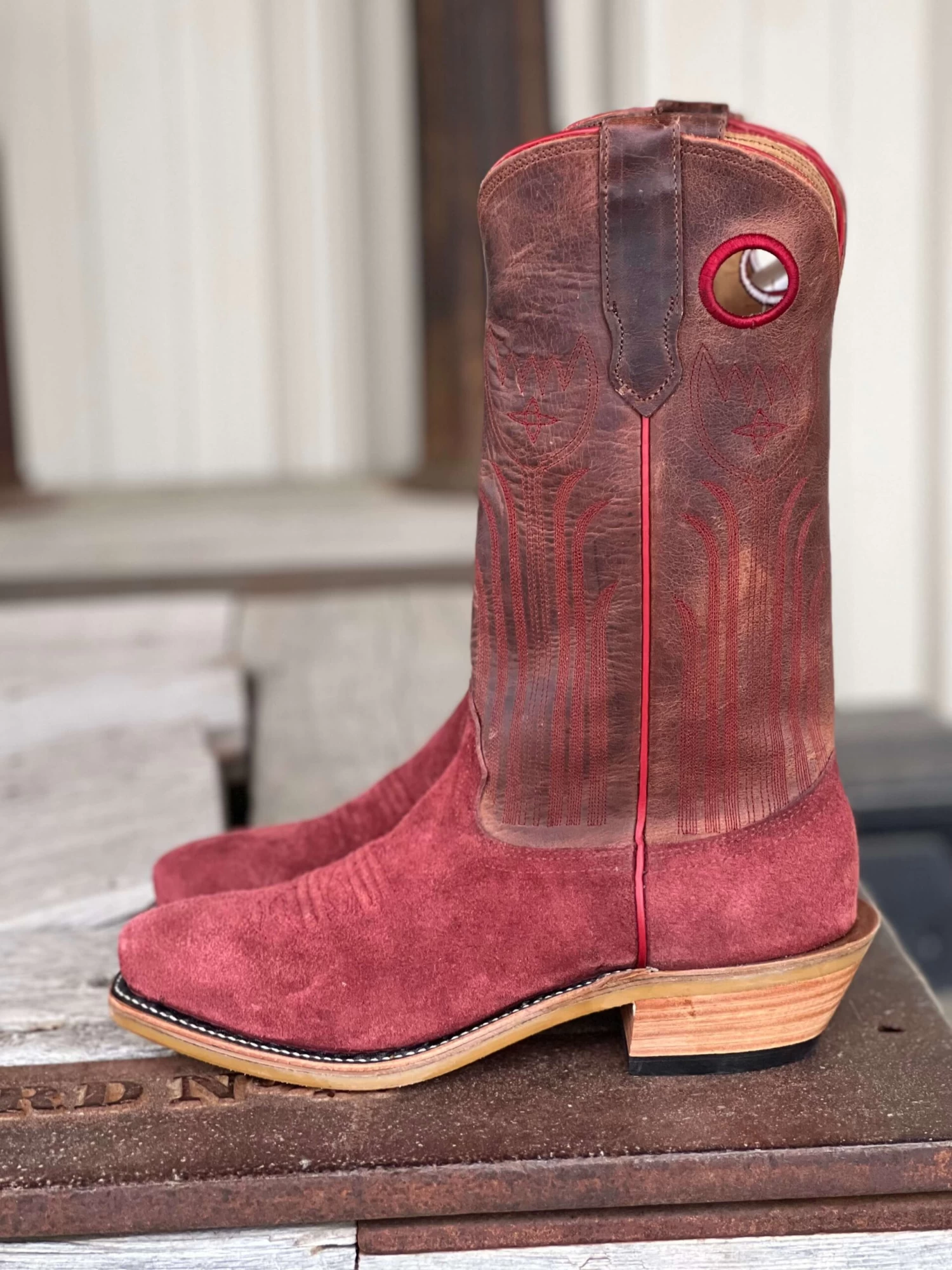 Vamp: Burgundy Roughout | Top: Sheridan Mezkite | Color: Burgundy/Brown | Top Height: 13″ | Toe: 0 | Heel: C (2″) | Sole: Ranch Tough | Proudly made in the USA |