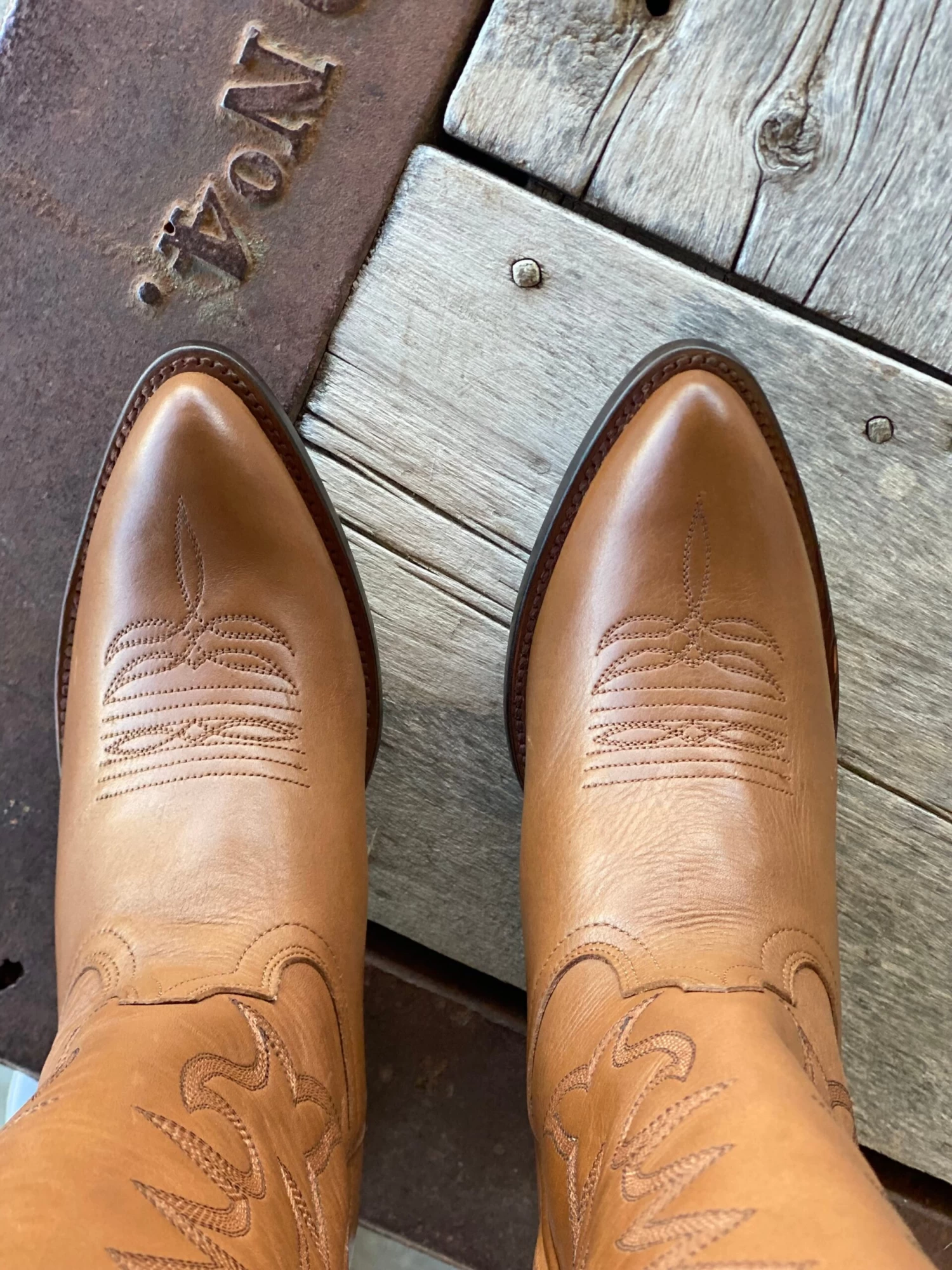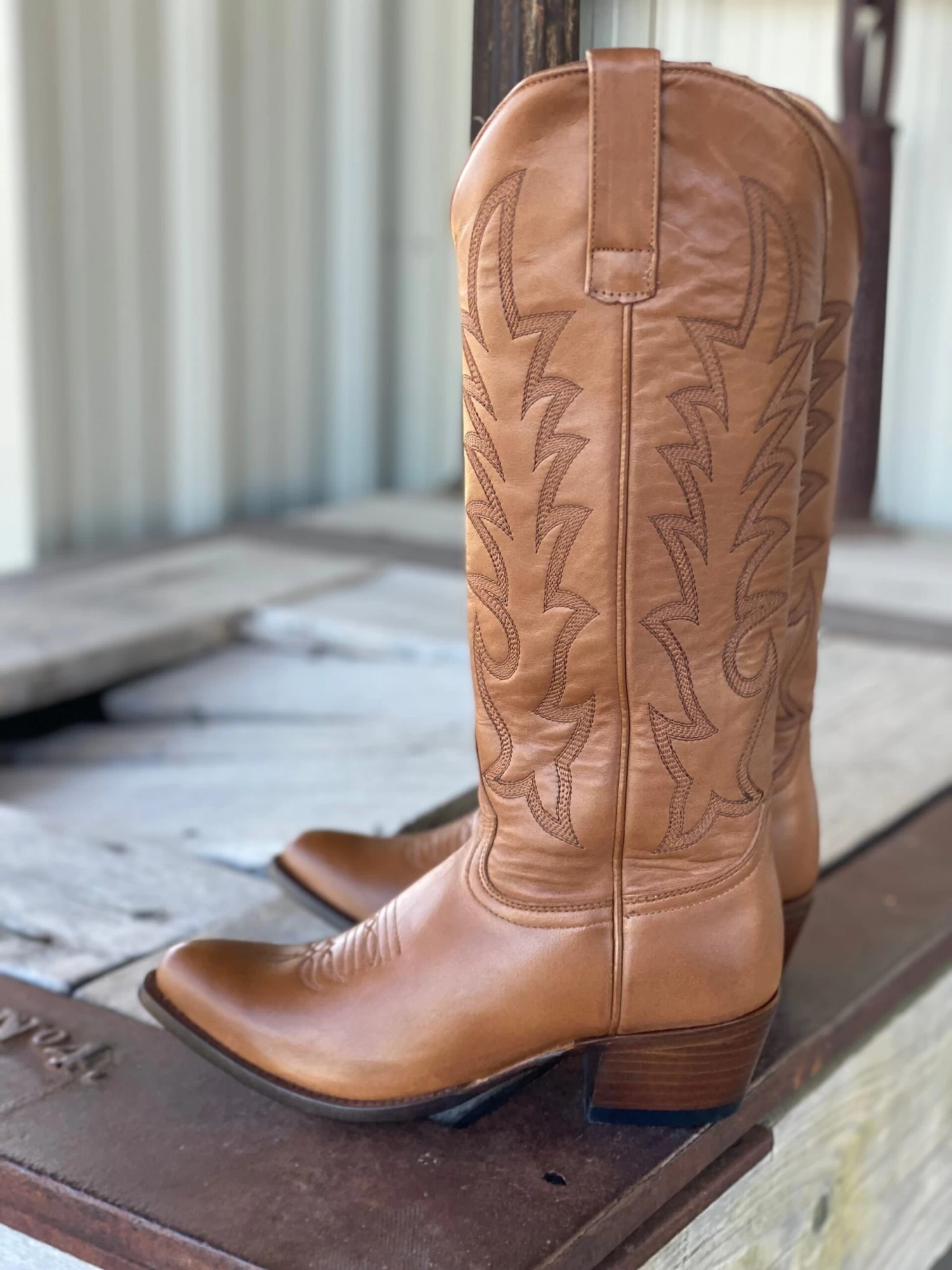 Vamp: Tan Telluride | Top: Tan Telluride | Color: Almond | Top Height: 15″ | Toe: RO | Heel: City Girl | Sole: Leather