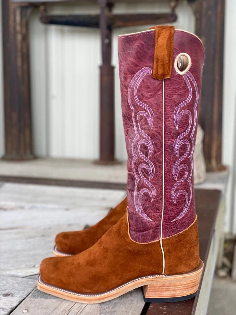 Ladies boot: Vamp: Tan Elk Roughout | Top: Deep Violet Bison | Color: Rust/Burgundy | Top Height: 16″ | Toe: Cutter | Heel: 1 1/2″L | Sole: Oxbow w/ Neoprene Midsole and Cush-N-Sole | Proudly made in the USA |